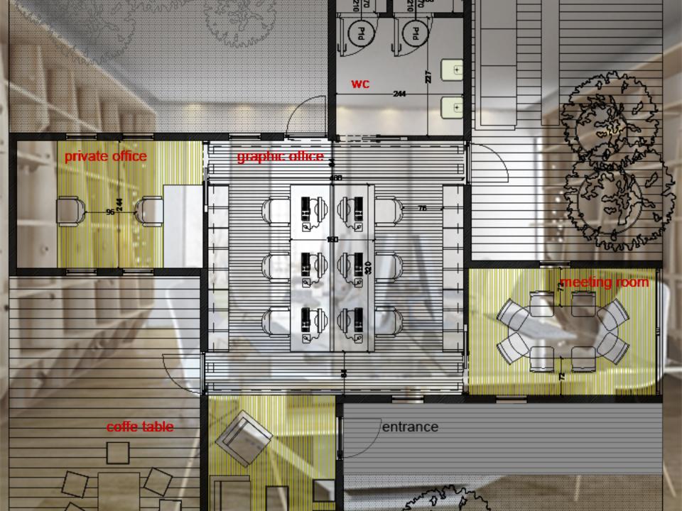 The main idea of the project is to put people togheter, to create a central space. In the plan the office does it’s look like a Palladian house, but the office is more than a simple form. I also studied all the materials, and all the furniture. In the main room the table is made of 2 pallets EPAL, and with a minimal glass. There are also 2 cabinets for the book with an intersting form. I paid attention first of all at the materials, and of course at the environmental effect.