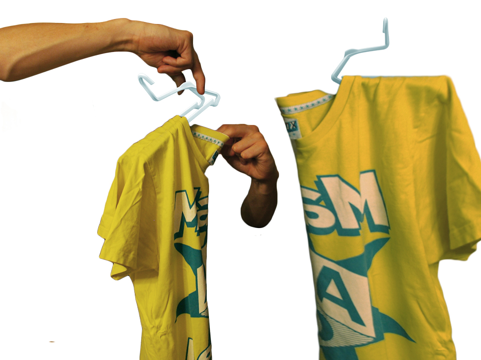 When exposed inside a cloth shop, the shape of this hanger makes it possible to see half of the front print of the t-shirt, and not just its side as with normal hangers, making it more accessible and easier to preview.