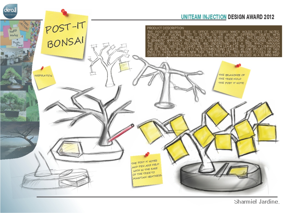 The post it bonsai tree is office accessory which holds post it notes. Instead of placing post it notes on or around different objects within the office area, the tree holds the notes in one area. This product could be well suited for creative professionals as the product could be used as a 3-d mind map.