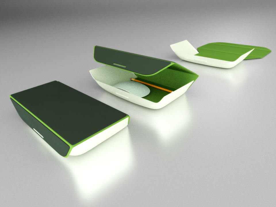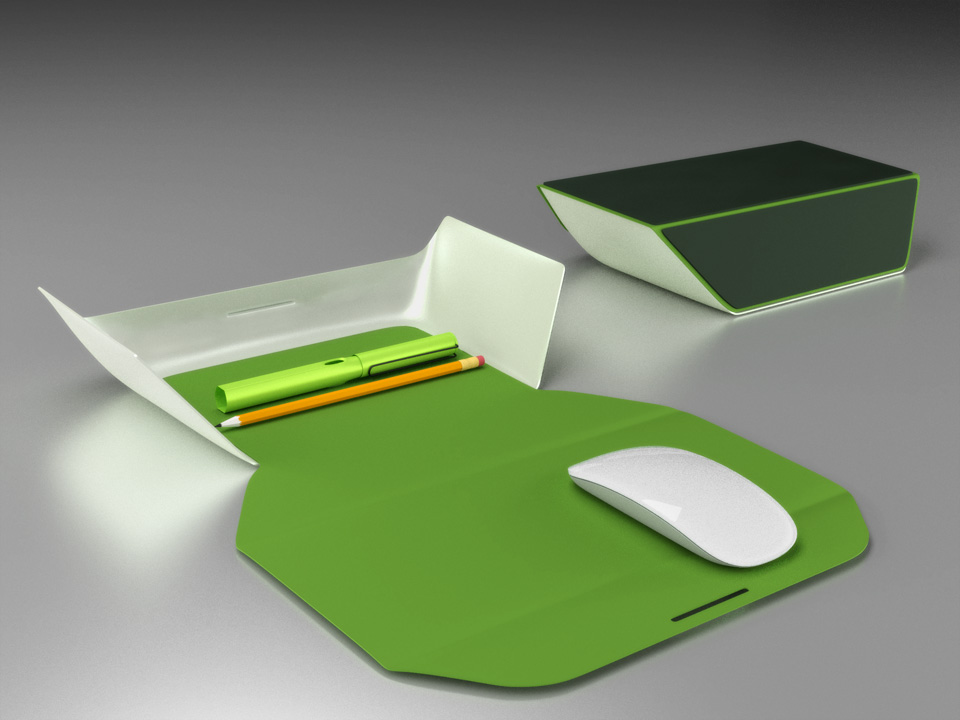 Desk box is a combination of a mousepad and a pencil case. Because of the fold lines, you can cover the plastic box with the mousepad. So you have a closeable box at your desktop and a transportable container for the mouse and other office tools if you are on the way.