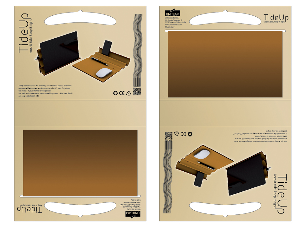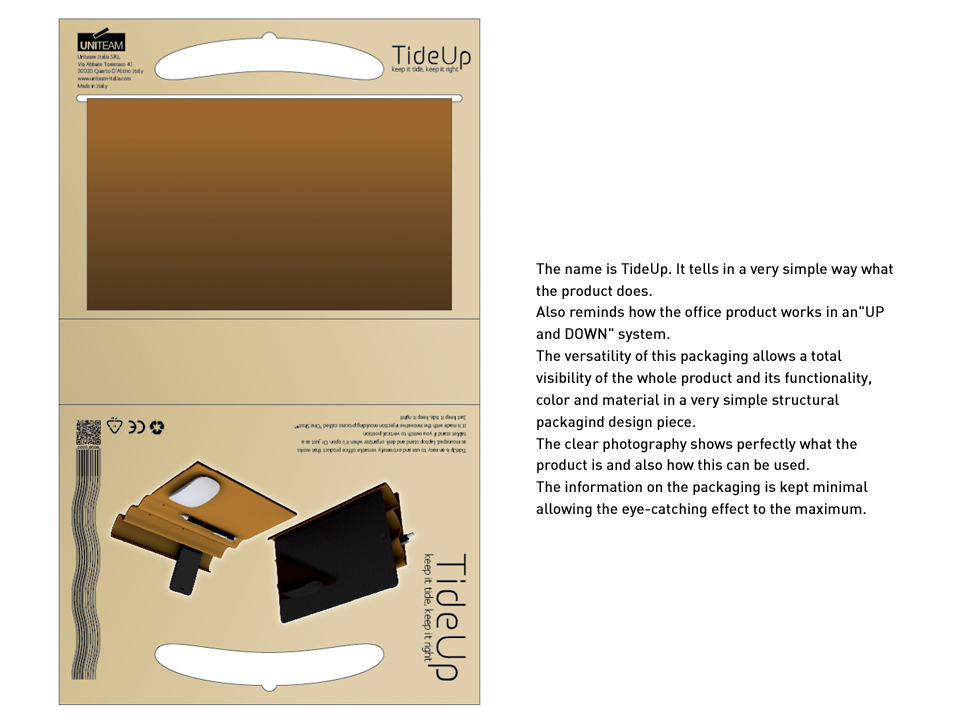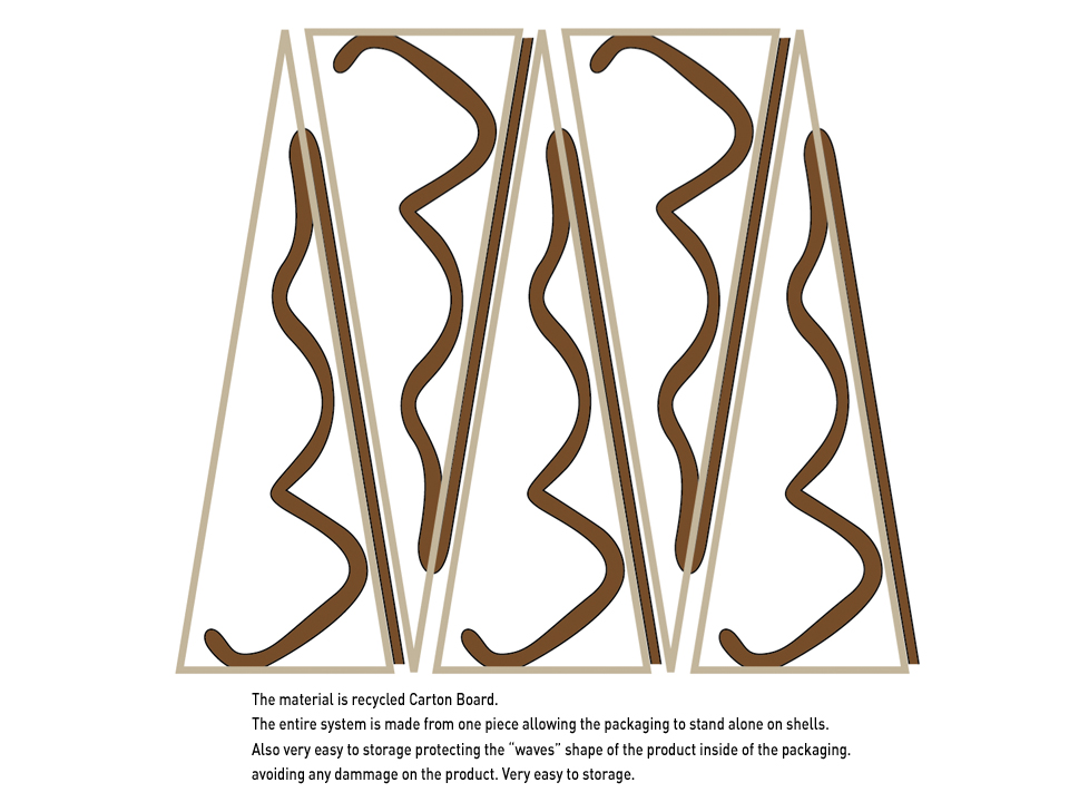 The entire structural system is made from one piece allowing the packaging to stand alone or to hang from shelfs. On one side the product is shown in the vertical position and in the inside the “waves” are protected by the packaging to avoid any dammage of the product.