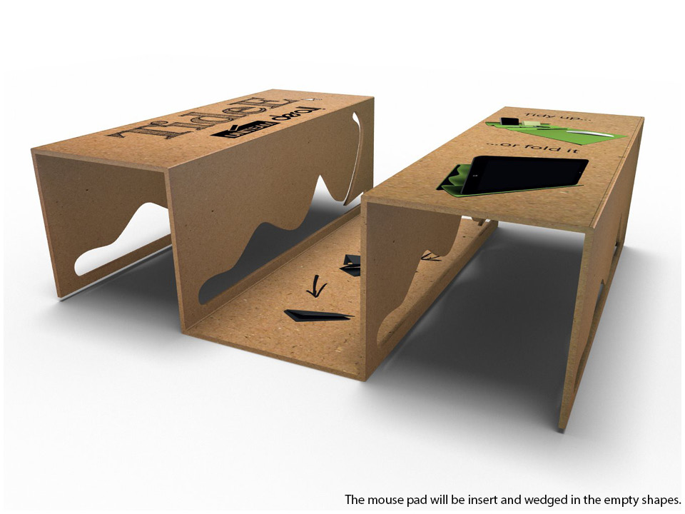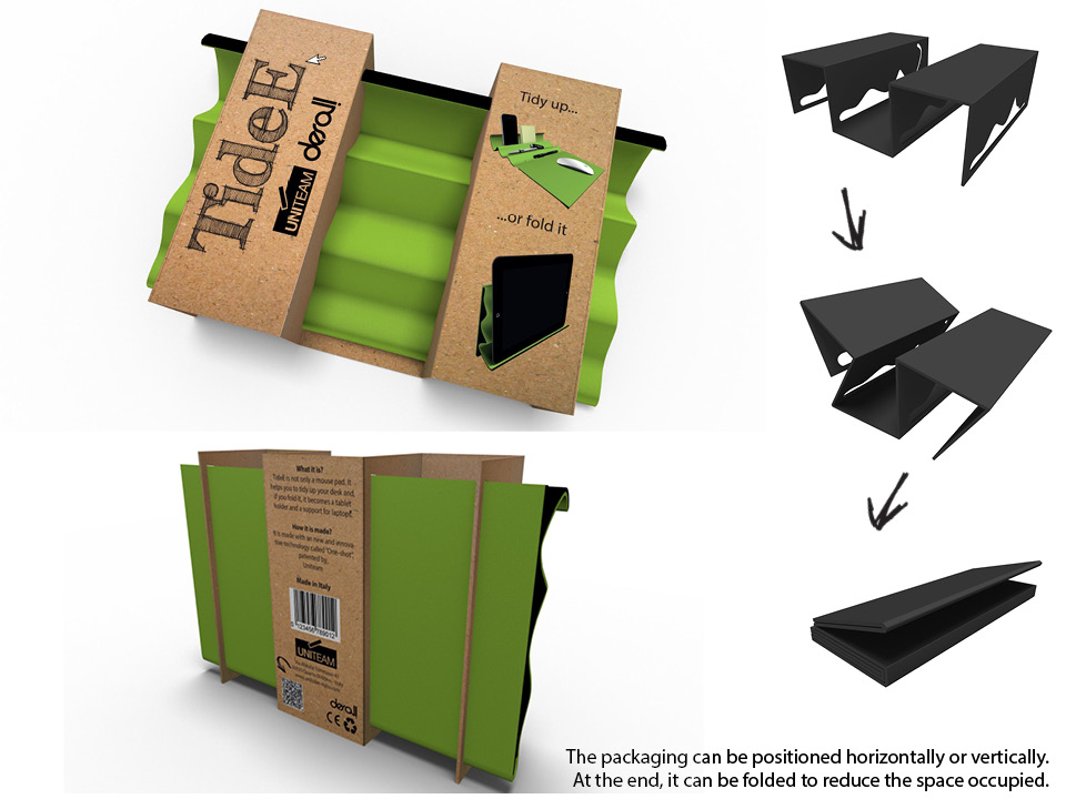 “Stripe” is a packaging that enhance the shape of the mouse pad. It was designed to contain but at the same time to show the product to the customers, to reduce the quantity and the weight of cardboard and to be easily foldable. It is composed of a little stripe of cardboard. In front there is the logo and some picture, behind there is a little description and some links.