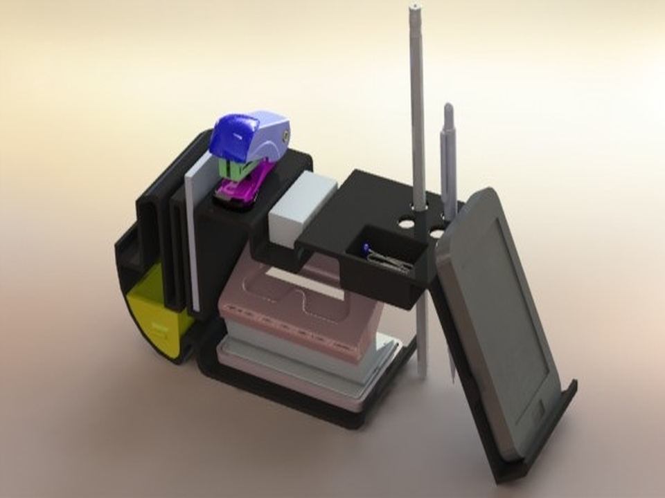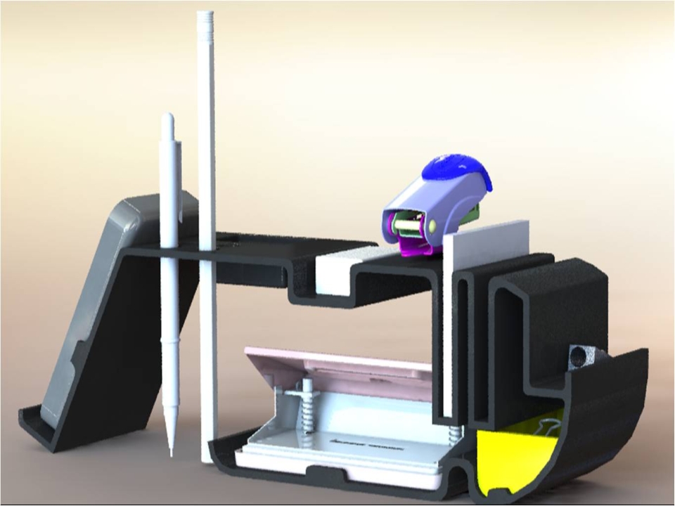 In today’s offices, study rooms at homes there’s a lot of clutter on our desk. We find paper clips on one side, punch on other. All the accessories are scattered here & there. This product ’Desk Assistant’ is the place where you can find the accessories like stapler, paper clips, pins, eraser, pencil, pen, sharpener, notepad, card holder, punch & many more kept in well organised way. Also it has a place to keep one’s mobile. This product also has a small drawer to keep any other accessories.