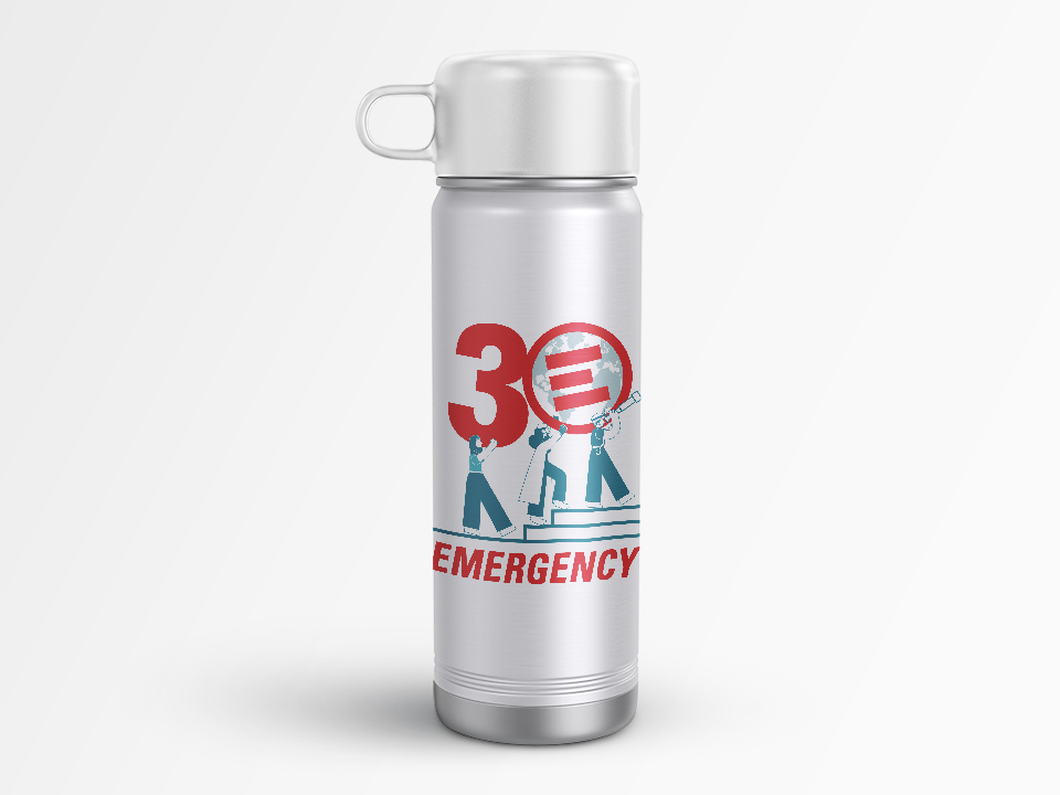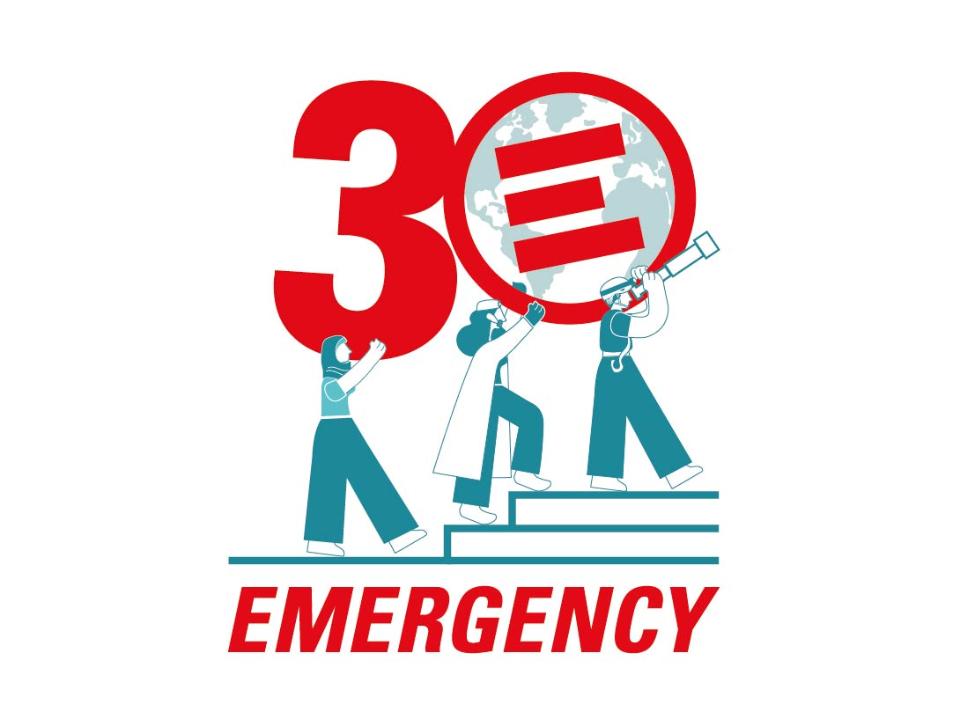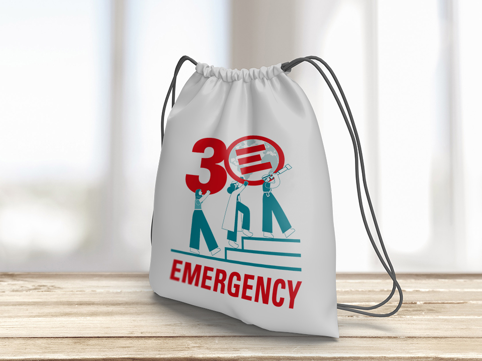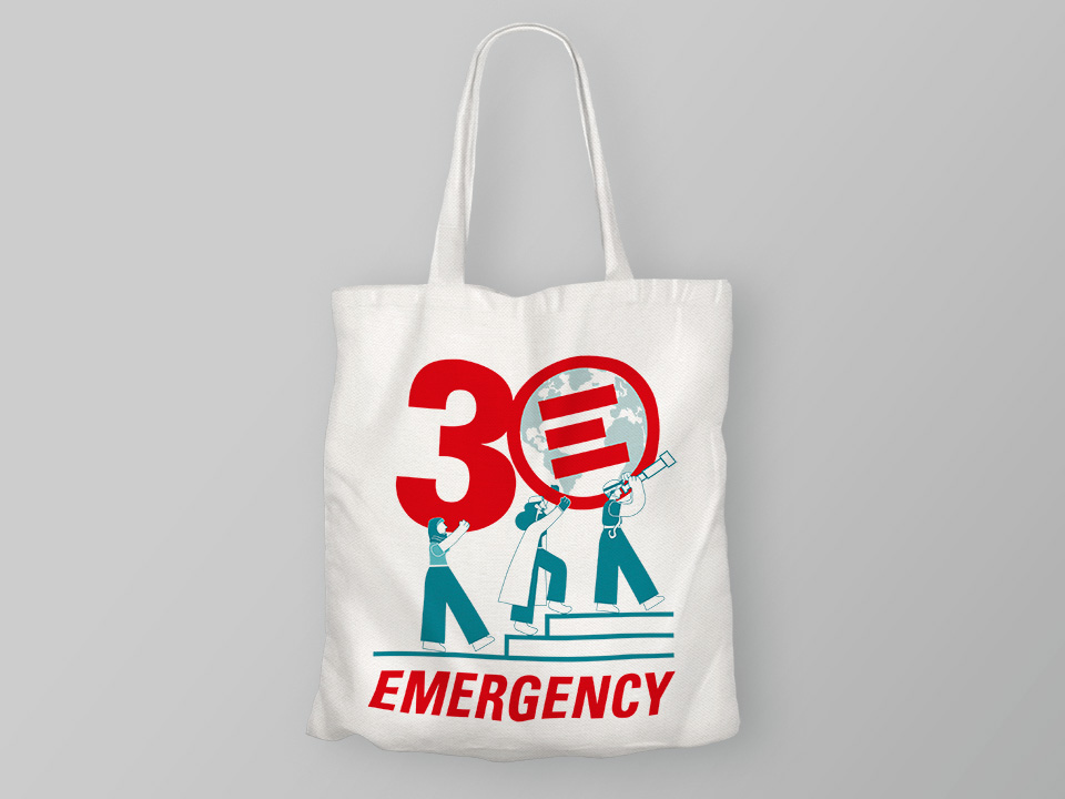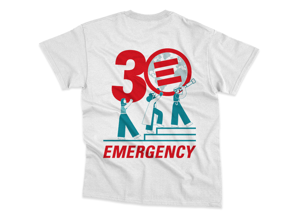 L’illustrazione celebra 30 anni di Emergency, mostrando il costante impegno delle persone che lavorano per sostenere l’organizzazione. Il numero 3 è sorretto da una figura che incarna tutti i volontari, mentre due figure chiave dell’organizzazione si uniscono nel sostegno trasportando il logo, che disegnato come un globo, simboleggia l’impegno mondiale di Emergency nell’assistenza a milioni di individui. Le tre figure si muovono verso un futuro promettente, simboleggiato anche dal telescopio.