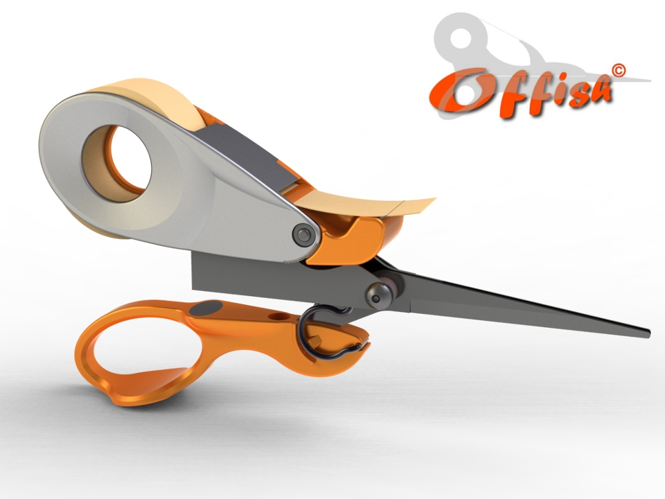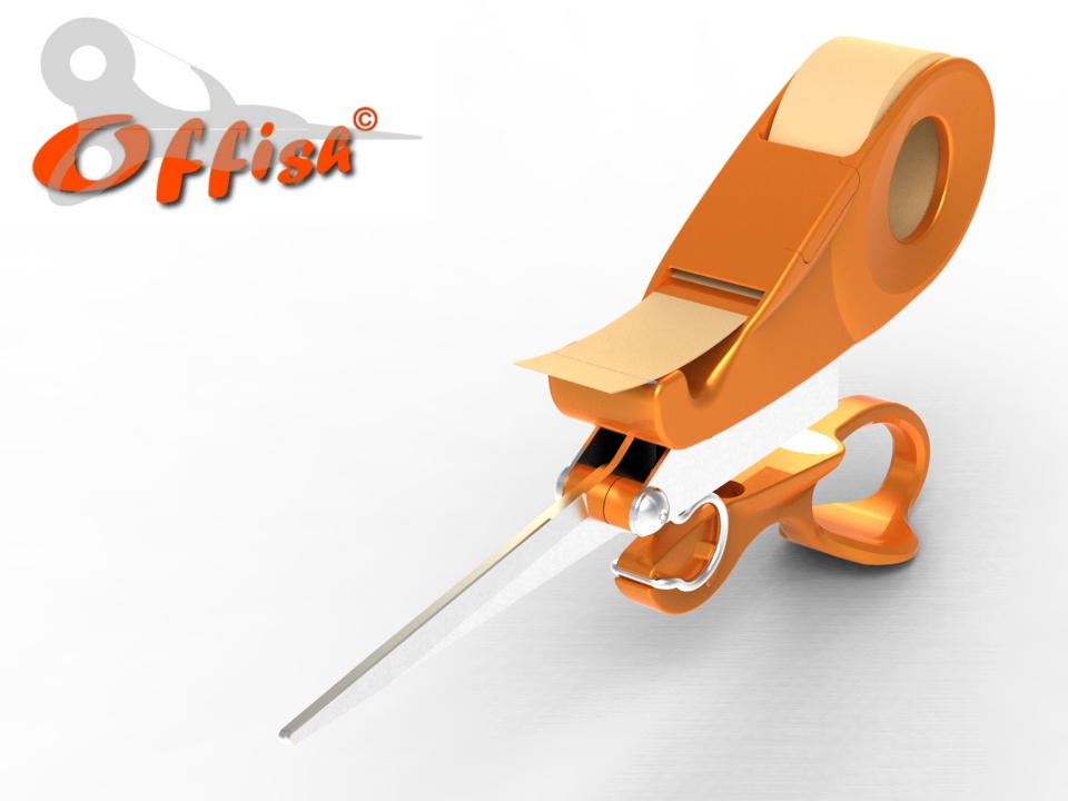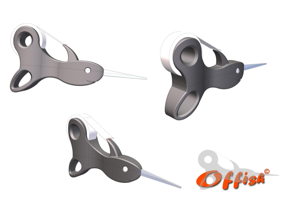OFFISH is a innovative combination of a stapler, scissors and a tape-dispenser. In the first sketches of the product it looked like a swordfish. Therefore FISH and OFFICE becomes OFFISH.