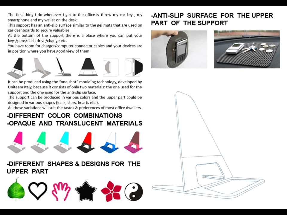 I wanted a simple office desk accesory that can hold my gadget (phone/tablet/e-book reader etc) and also the other miscellaneous objects that I carry with me (keys/wallet/change/pens&pencils). This office accesory is easy to produce using the OneShot technology and can be moulded in various shapes&sizes and from different materials.