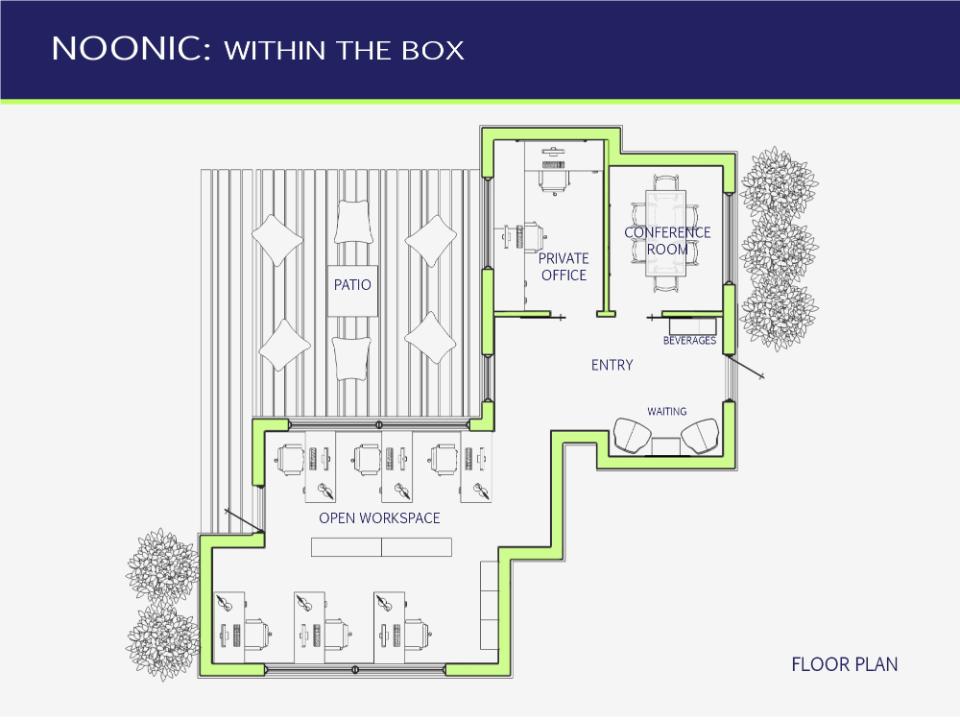 In using container boxes, this work space is a prime example of how simple materials can be manipulated to create one of a kind spaces. This idea is carried throughout the design from the general layout through to finishes and furniture selections.