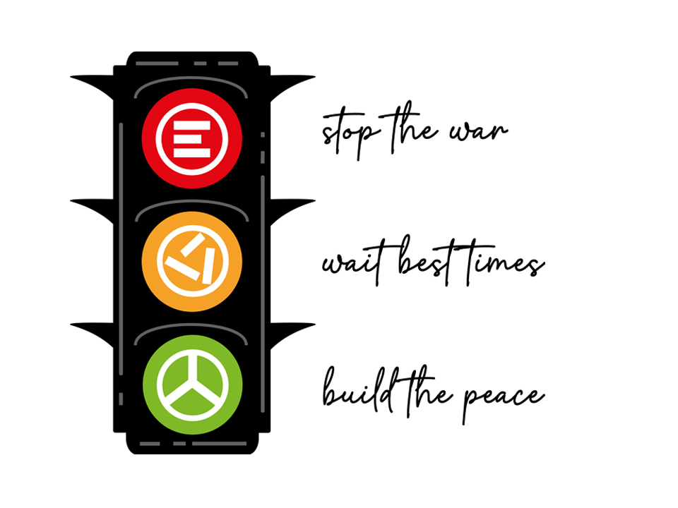 Ogni uomo incapace di porre dei limiti a se stesso genera guerra. Partendo da questo presupposto ho voluto immaginare una segnaletica universale, un semaforo capace di avvertire il pericolo di un conflitto e aiutare i pedoni delle strade del mondo ad attendere tempi migliori per costruire la pace.