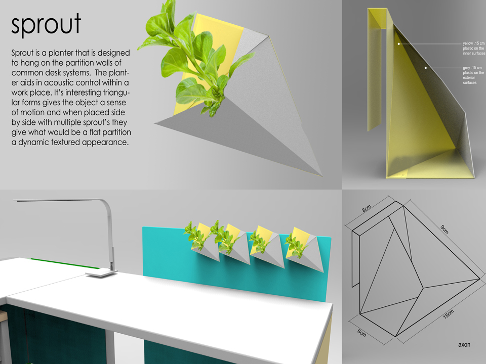 Sprout is a planter that is designed to hang on the partition walls of common desk systems. The planter aids in acoustic control within a work place. It’s interesting triangular forms gives the object a sense of motion and when placed side by side with multiple sprout’s they give what would be a flat partition a dynamic textured appearance.