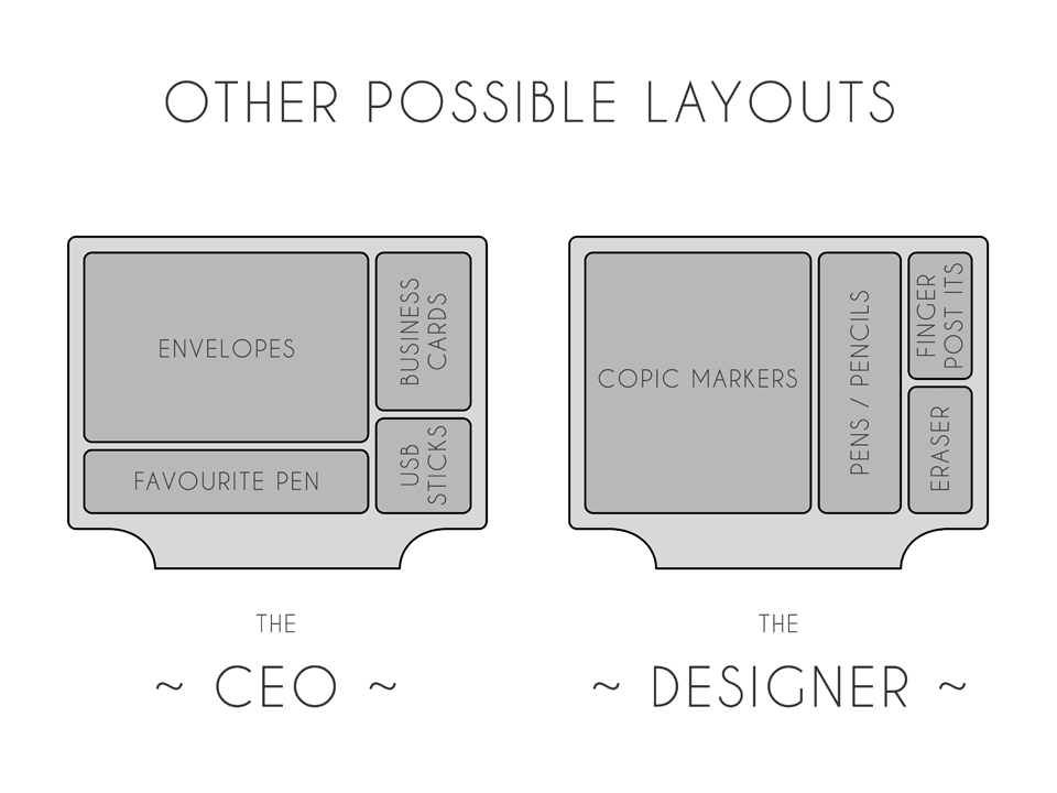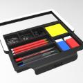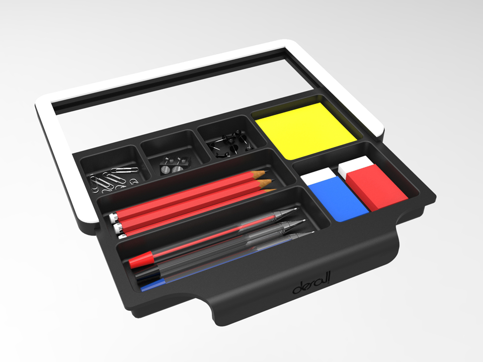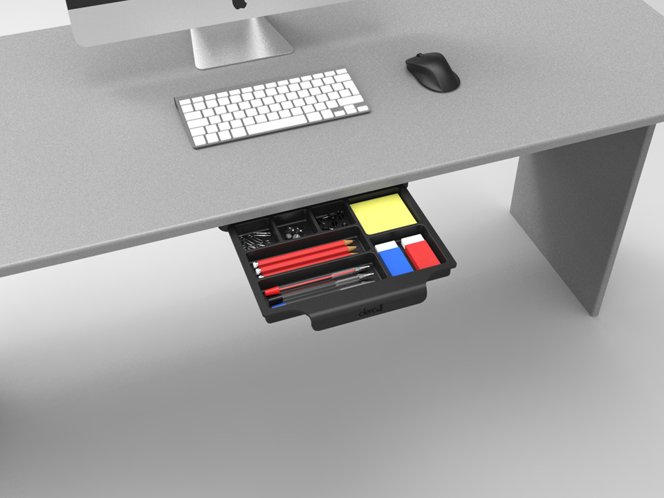 The Drawer Plus is an efficient, cost effective solution for freeing up precious desk space by neatly organising stationary in a smart, slim line drawer that can be easily attached to the underside of the table using strong adhesive strips such as 3M. It is not just limited to the office; it would also be very suitable for schools and the home. Later editions could include different layouts of the compartments for varying user needs.