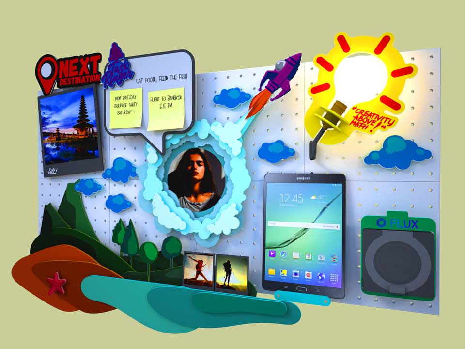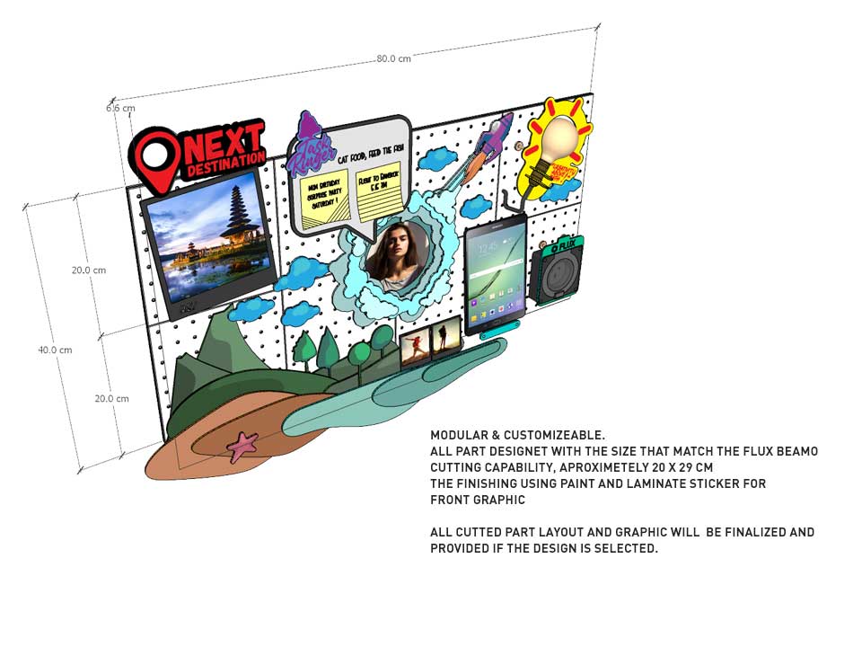 The basic idea is the to create a system that capable to hold gadget and the result is a wall panel that apply peg board as the base and some accessories created from laser cut sheet joined using dowel as the holder.- Description