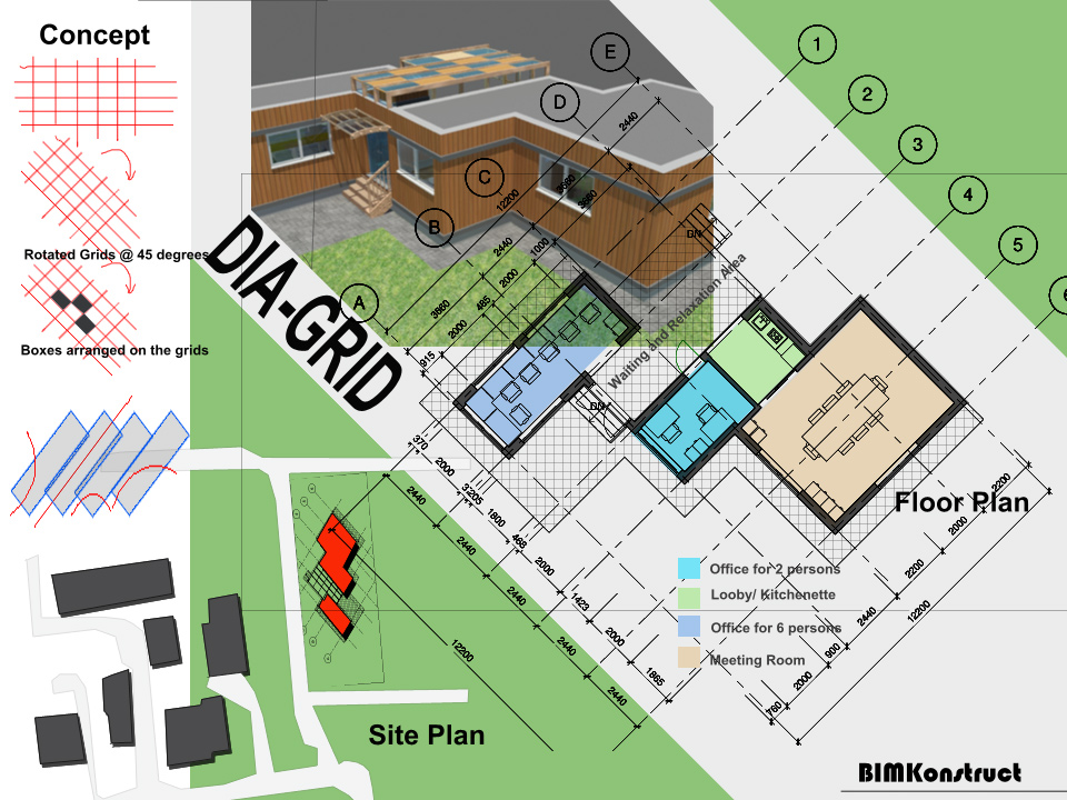 I wanted to design something than just dropping the boxes on the site, something architectural that will emerge from a pattern, shape or geometry. While playing around with shapes and pattern I came up with “dia-grid” which was derived from staggered rotated draft pattern drawn and spaced equally across the site. When the boxes are strategically placed along the dia-grids, a structure that depicts its function as an office building was developed.